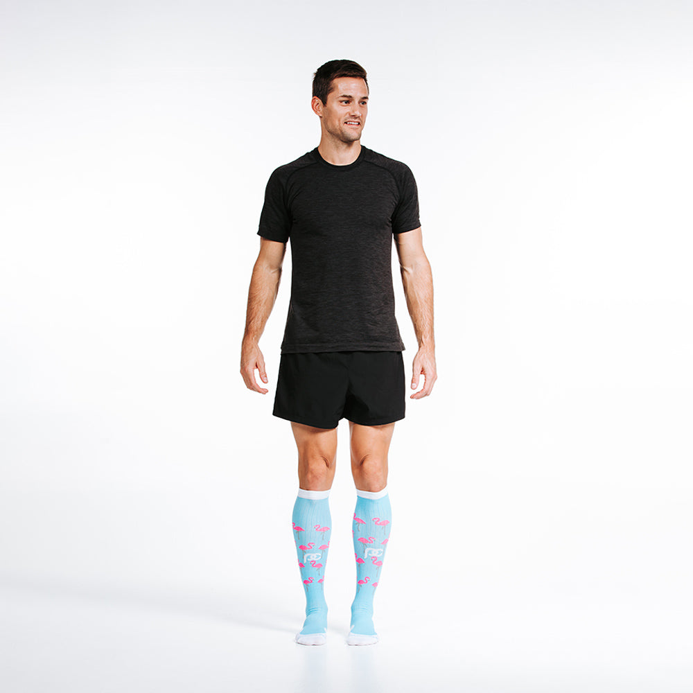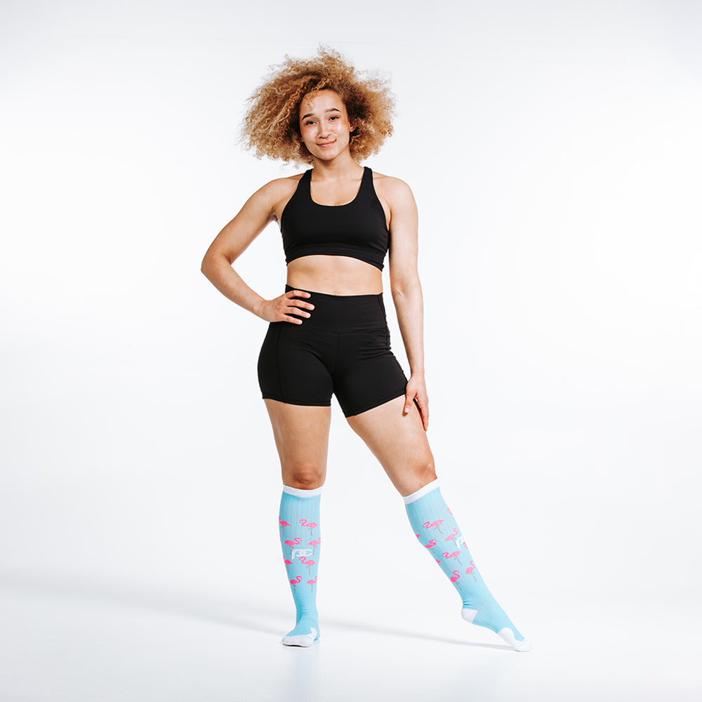 These fun compression socks are white and light blue hues with a lively flamboyance (AKA flock) of our pink feathered friends! Flamingos symbolize balance, caring for others, and belonging to a community.