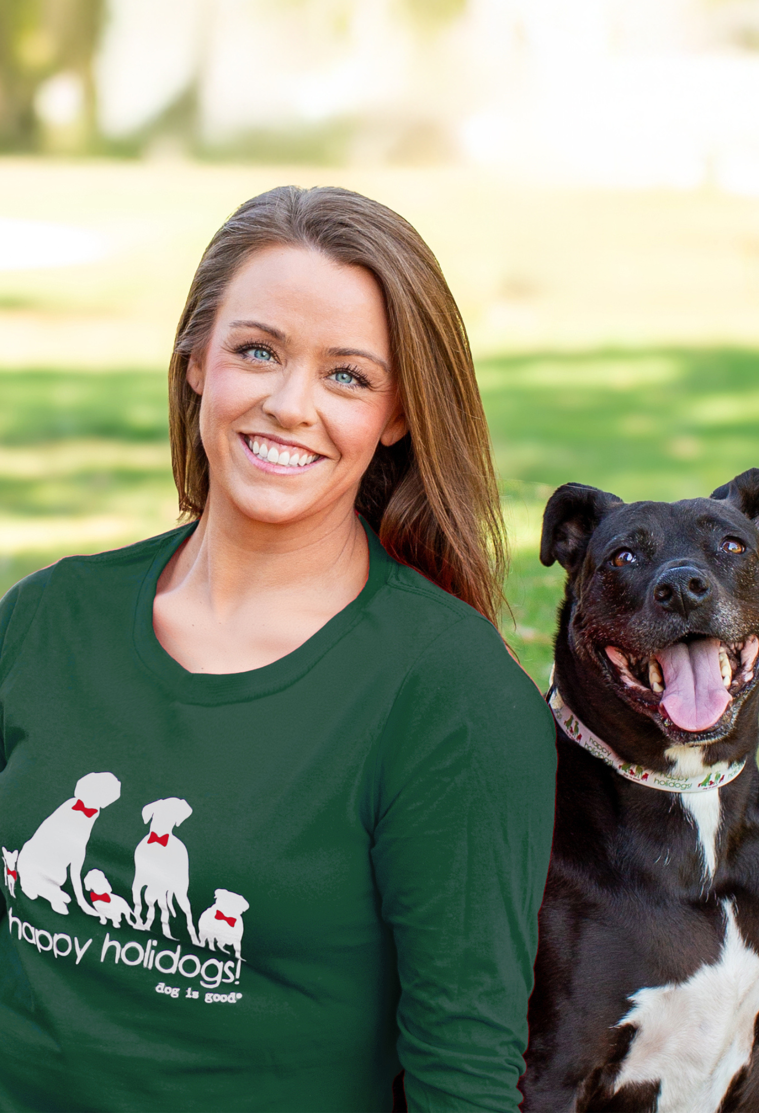 Long Sleeve T-shirt: Happy Holidogs Dark Green (Holiday) - Small is backordered and will ship as soon as it is back in stock.