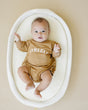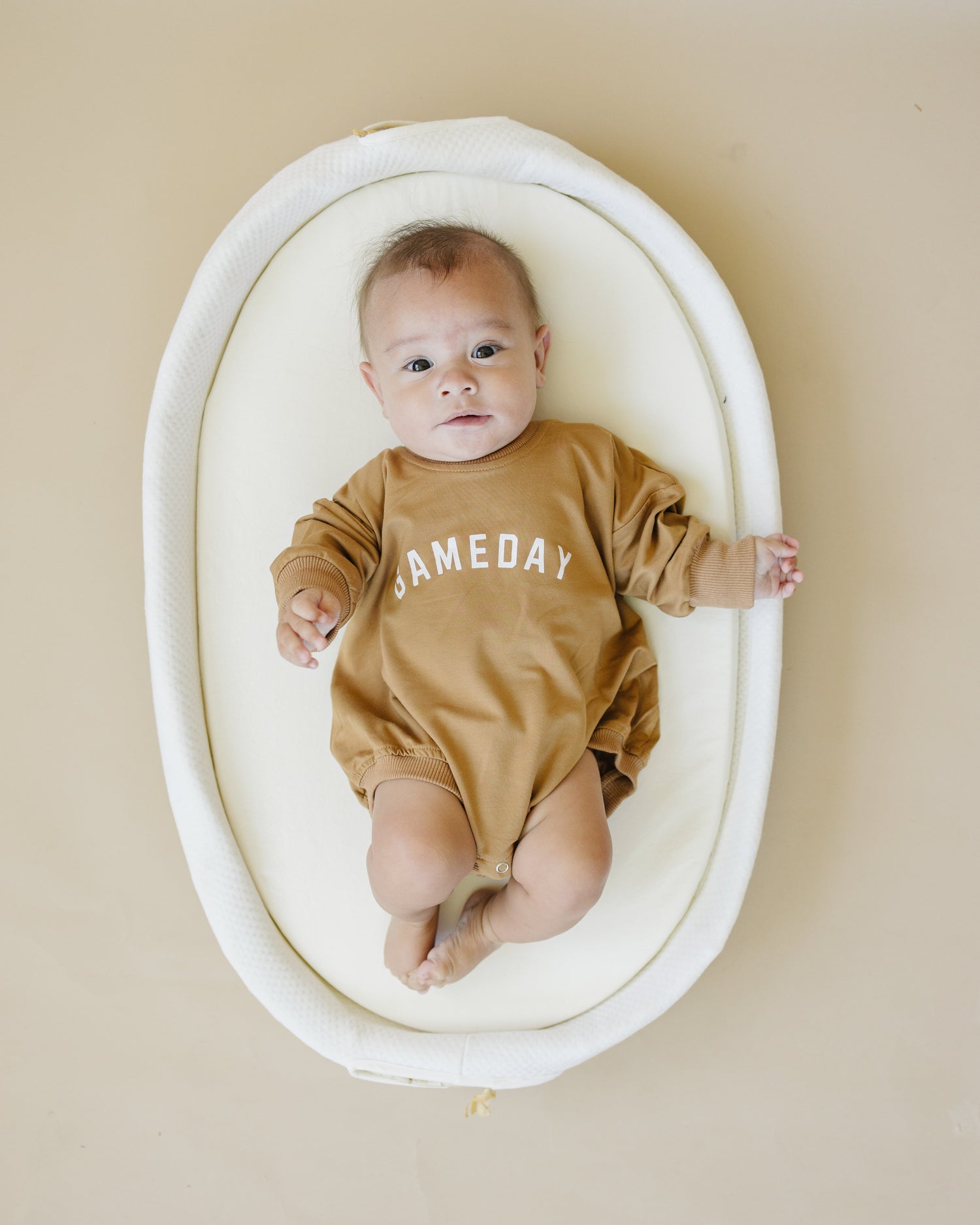 Gameday Sweatshirt Romper: Get your little one ready for game day with this cozy romper. Made from a comfy blend of French terry fabric, it consists of 83% cotton and 17% polyester, ensuring warmth and style for your baby or toddler's game day outfit.