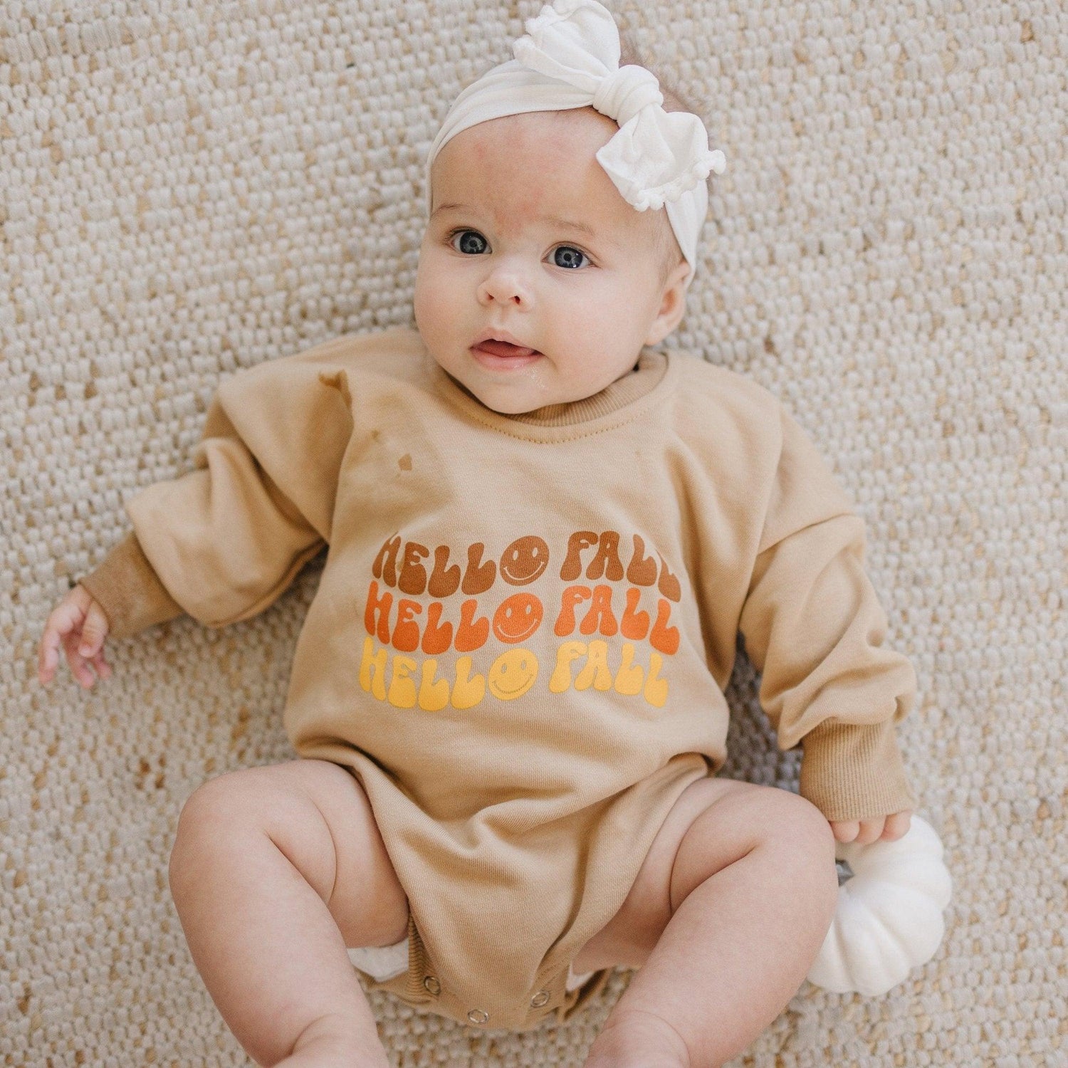 "Hello Fall" Graphic Oversized Sweatshirt Romper - Embrace the spirit of autumn with this comfortable and stylish oversized sweatshirt romper. Featuring practical snaps at the crotch, it guarantees easy dressing and diaper changes. Crafted from lightweight terry material composed of 83% cotton and 17% polyester, it offers both warmth and flexibility. The "Hello Fall" graphic is screenprinted, ensuring a durable and vibrant design that won't lift or peel. Get ready to greet the season in comfort and with a fashionable flair!