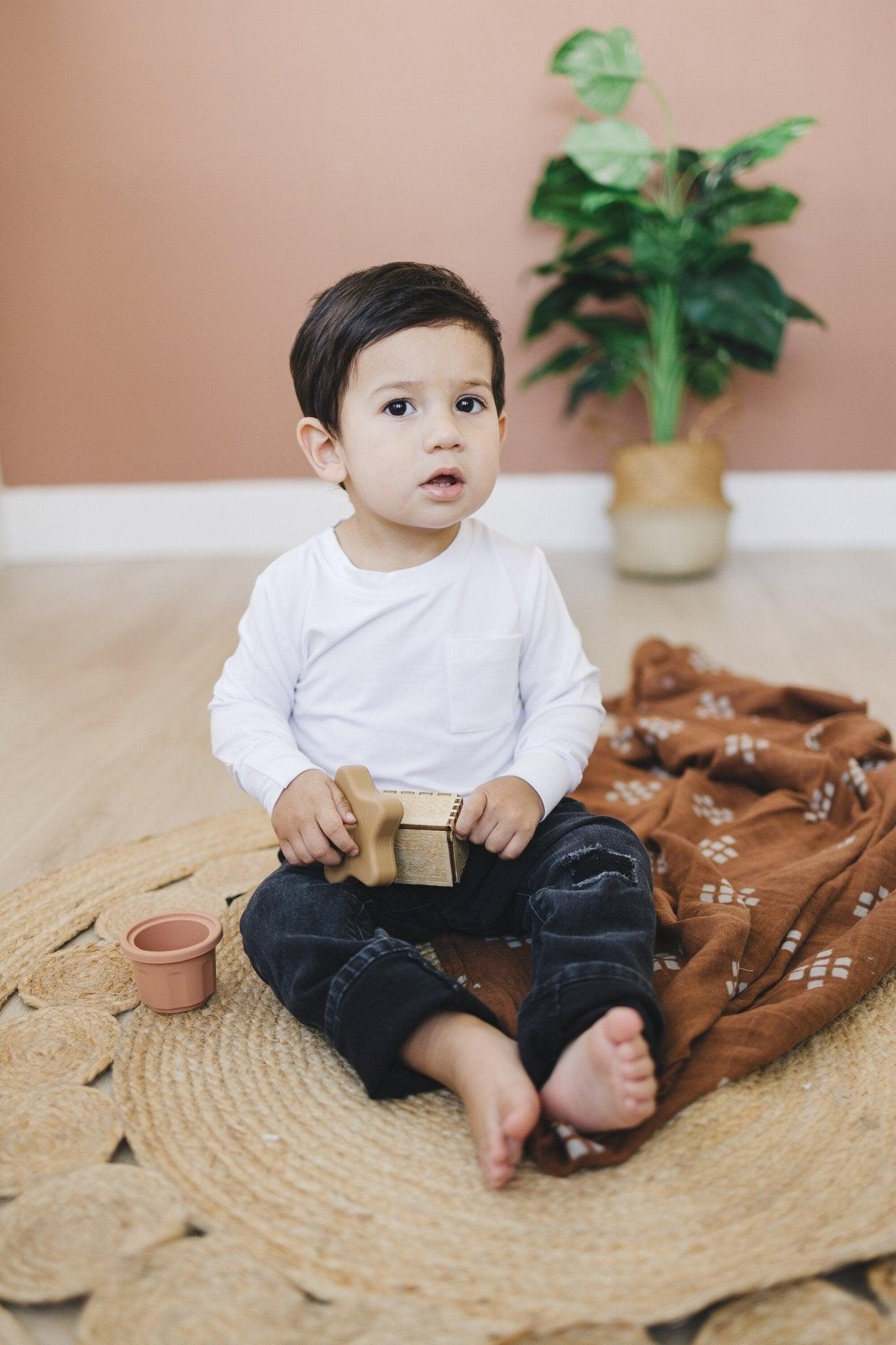 Our Long-Sleeved Bamboo Pocket Tee is the perfect blend of comfort and style. With six trendy colors and sizes from 0-3 months to 4T, this tee, made from 94% bamboo viscose and 6% spandex, is soft, breathable, and stretches with your child. The tee features a practical pocket, adding a playful touch, and runs true to size for a comfy fit. Elevate their wardrobe effortlessly with this versatile, easy-to-care-for tee. Order now and let your little one experience all-day comfort in style!