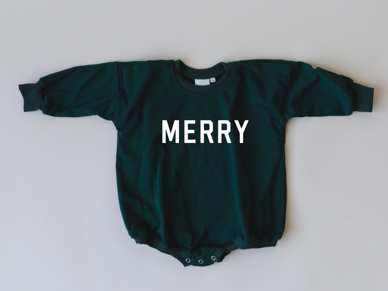 Merry graphic oversized sweatshirt romper with snaps at crotch. Lightweight terry material.