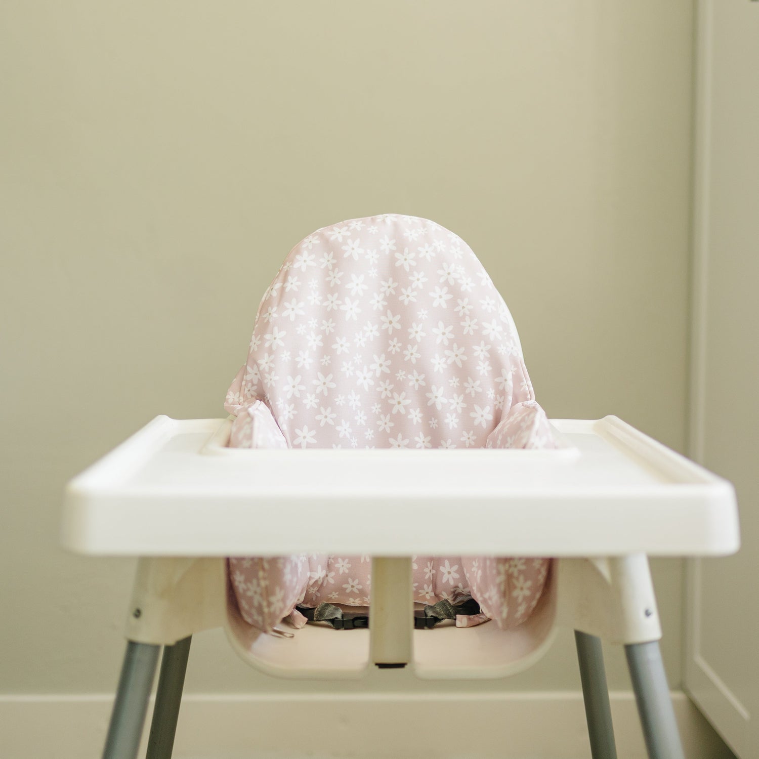 White Flowers on a pink background! Wipeable cushion cover for the IKEA Antilop Highchair