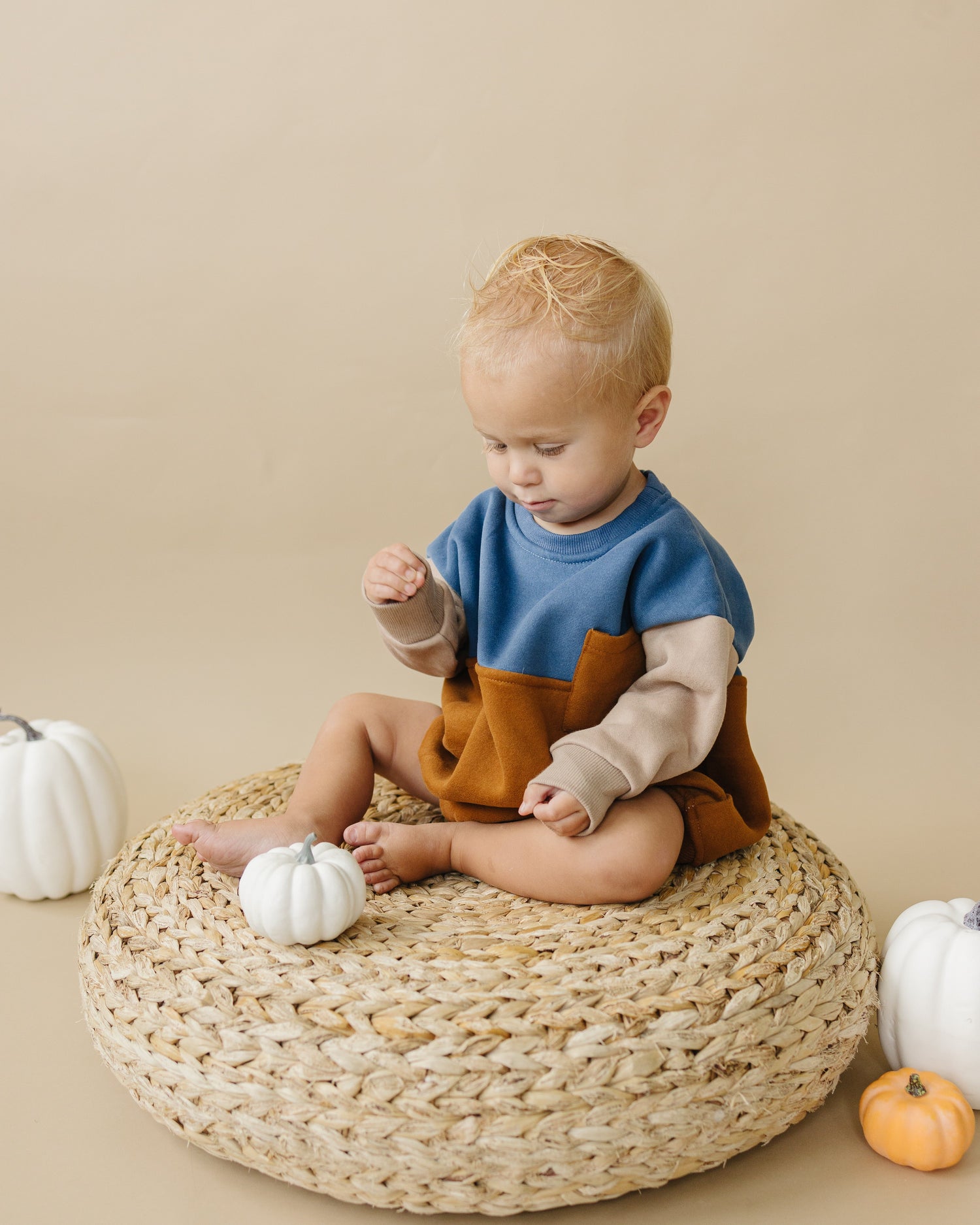 Little Joy Co. x Salt and Pine Color Block Oversized Sweatshirt Romper - Embrace autumn vibes with this cozy and stylish oversized sweatshirt romper. Featuring a convenient snap closure at the crotch, it guarantees easy dressing and diaper changes. The charming fall themed color blocking design ensuring a solid style for boys and girls this fall!