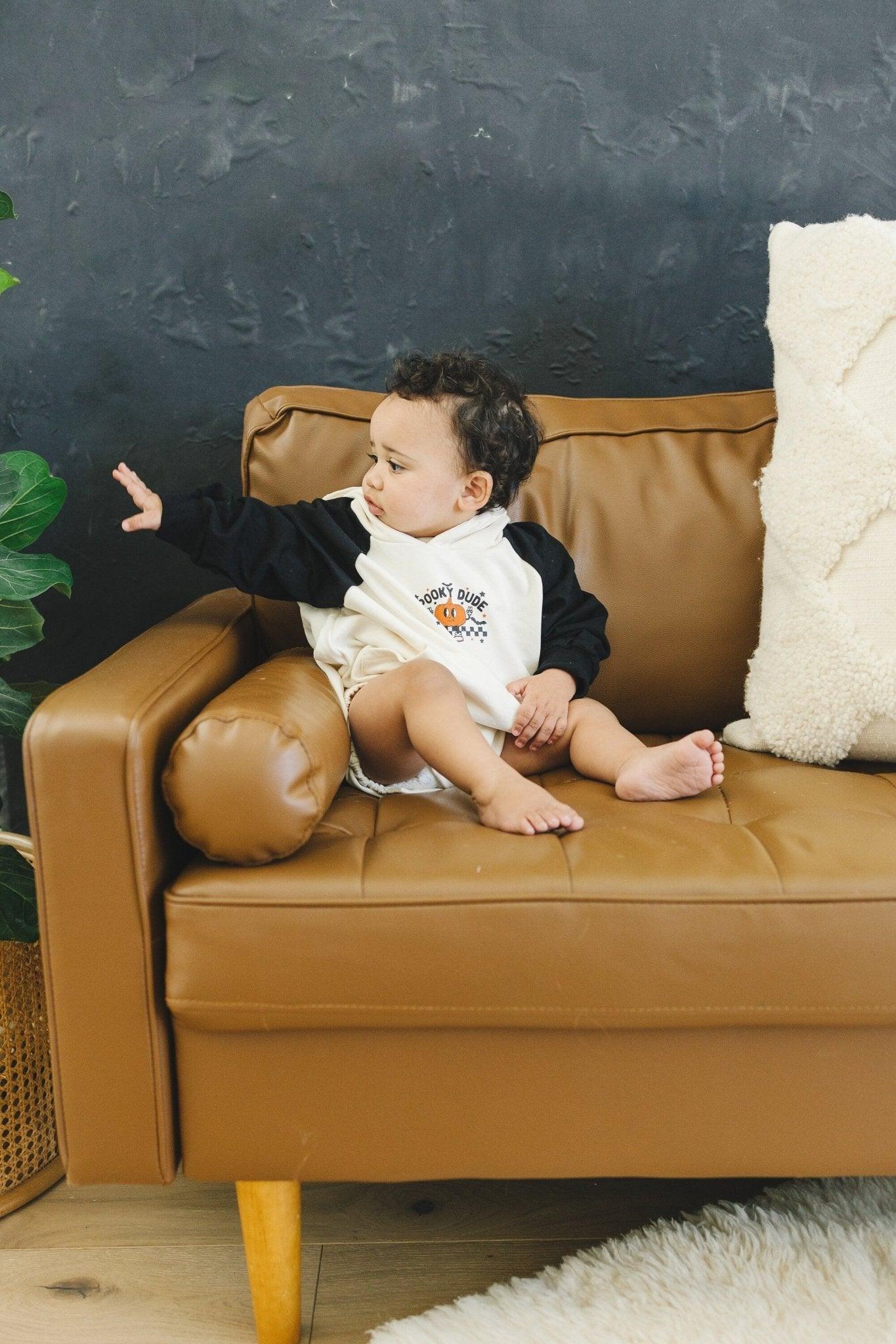 Elevate your Halloween style with our "Spooky Dude" Hooded Sweatshirt Romper. This unique romper embraces the trick-or-treating spirit with its playful design, making it the perfect choice for Halloween festivities.