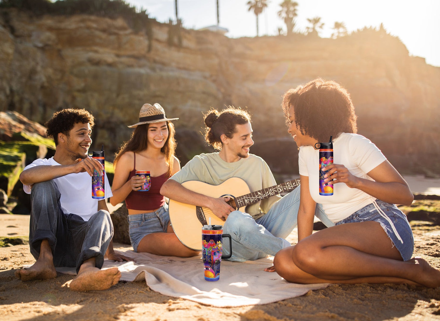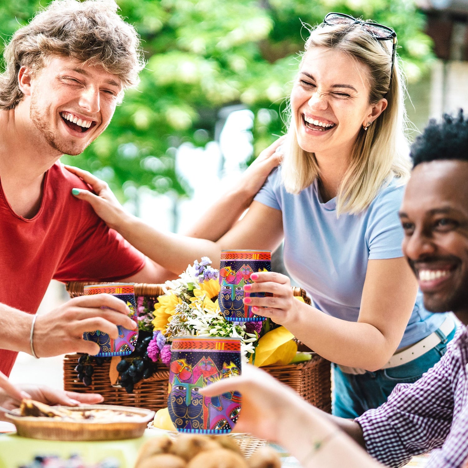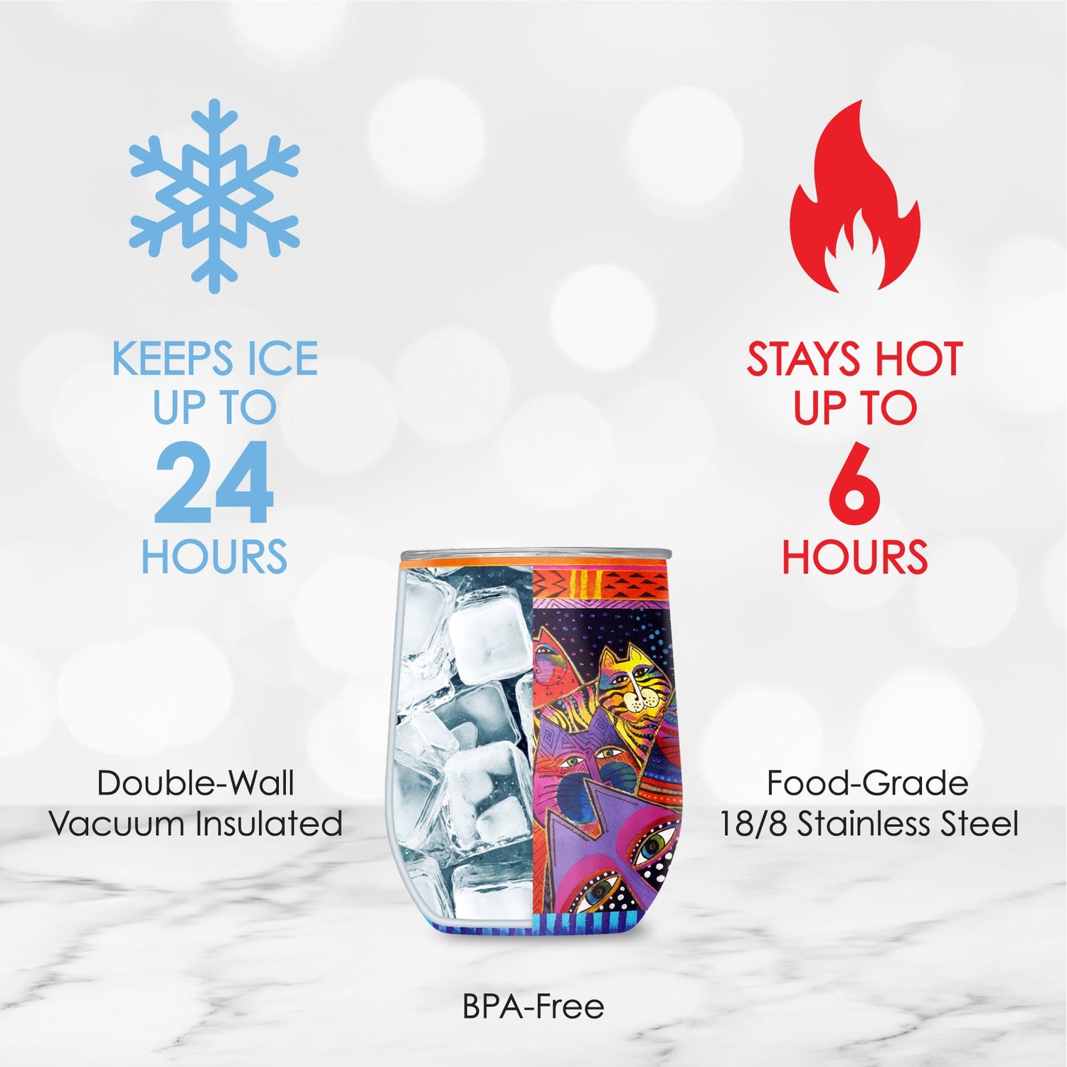 Discover the perfect blend of style and practicality with our Stainless Steel Wine Tumbler. The sleek, modern design of this Tumbler makes it a fashionable accessory for any occasion. Whether you're hitting the gym, the office, school, or the trails, it's the perfect choice. This double-wall vacuum insulated Tumbler keeps beverages hot for 6 hours and cold for 12, keeps ice frozen for up to 1 day ensuring you're always refreshed. Crafted from durable, BPA-free 18/8 stainless steel, it's a sustainable and eco-friendly choice. The leak-proof design guarantees a mess-free experience, while the wide mouth simplifies cleaning. Elevate your hydration game, reduce waste, and enjoy hassle-free adventures with this travel-friendly companion.Our product features exquisite designs inspired by the timeless artistry of Laurel Burch. Burch's art is renowned for its vibrant colors, whimsical designs, and uplifting themes. Her unique style features bold patterns and fantastical creatures, celebrating joy, love, and the human spirit. Each piece of Laurel Burch art brings a sense of wonder and enchantment, making it a perfect addition to any collectionStunning rendering of Laurel Burch famous art, "Fantasticats." The design is captured with an artist's eye for detail, light & color.