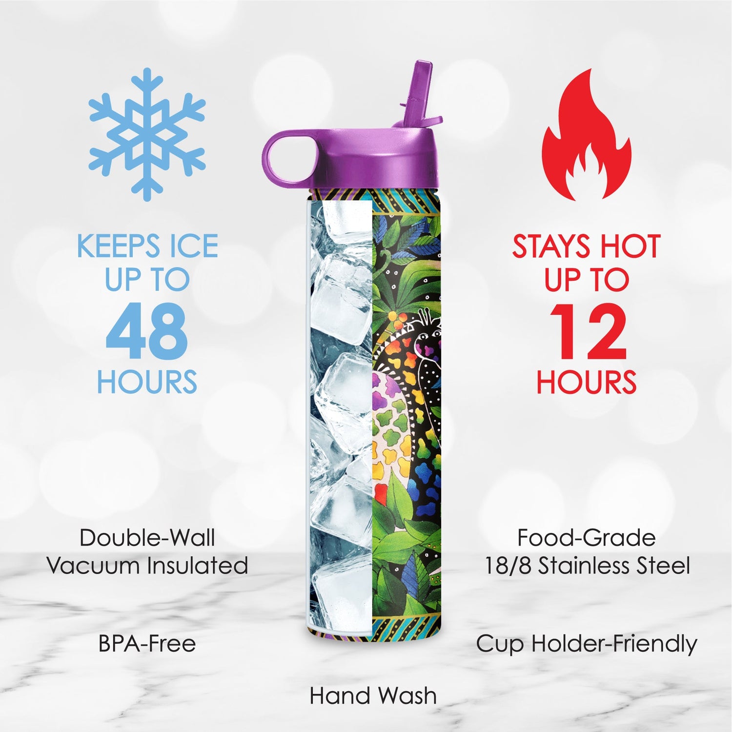 - BPA-free 18/8 stainless steel, double-wall vacuum insulated to keep hot beverages hot up to12 hours; cold drinks up to 30 hours, keeps ice frozen for up to 2 days