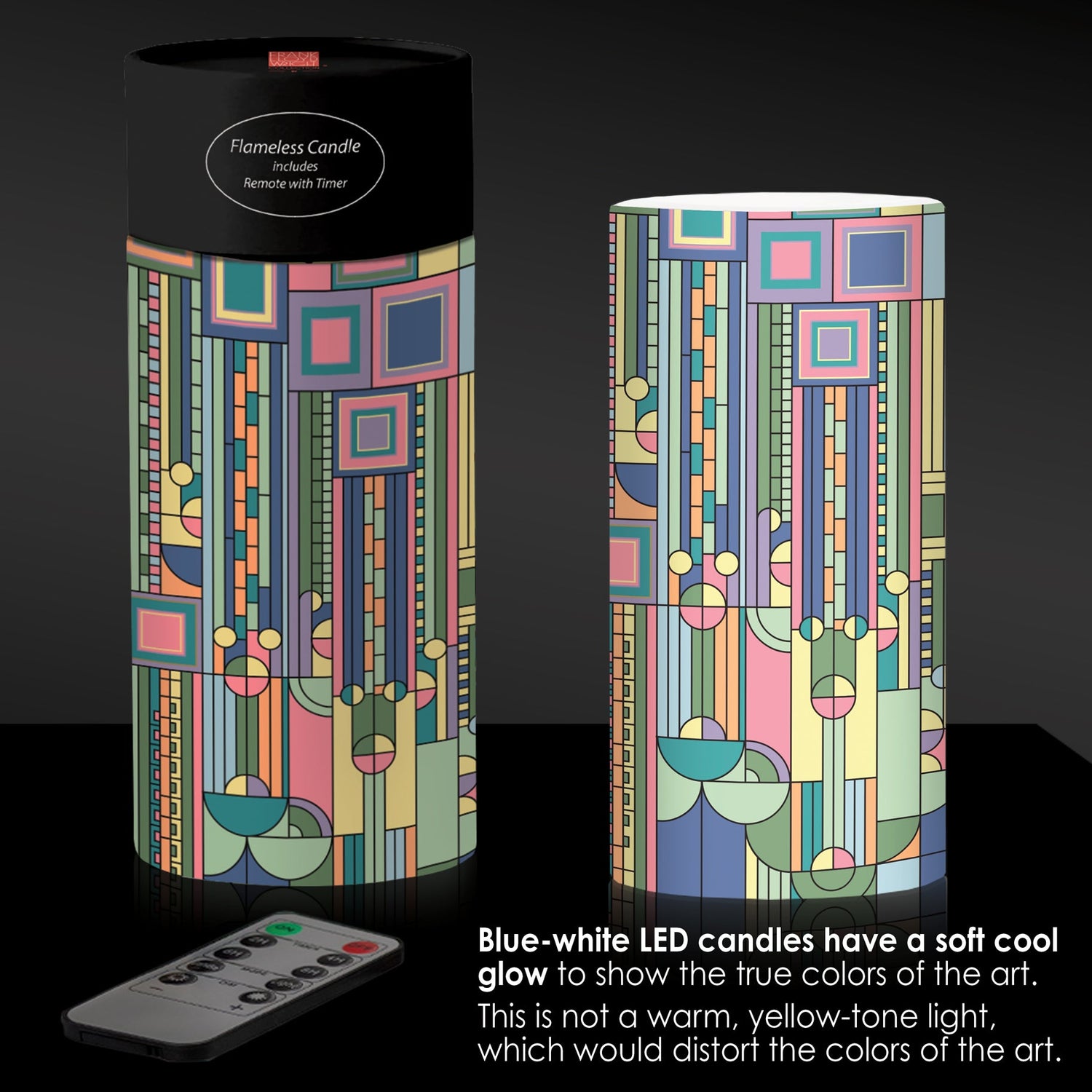 Softly illuminate any room with these elegant 6" Flameless LED candles. Fragrance-free, real wax candles light the stunning wraparound artwork from within. Each candle includes a remote control with timer and dimmer settings- choose flickering candle mode or steady glow. Flameless candles are safe for any room in your home, can be left unattended, and make a beautiful night light.