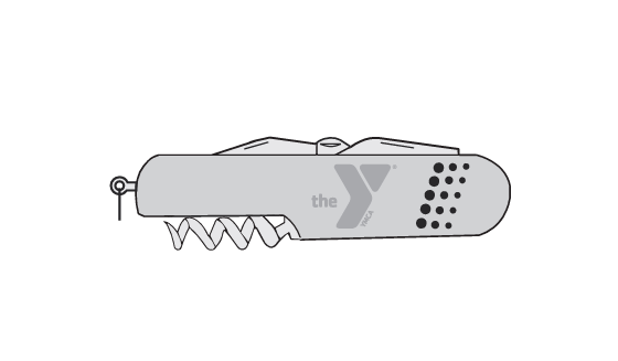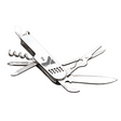 Knife, scissors, bottle opener, can opener, Phillips screwdriver, flathead screwdriver, nail file, corkscrew, punch, split ring, steel construction.