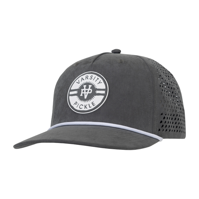 It's a performance rope hat made with a light grey, suede material and a white starburst Varsity Pickle logo.