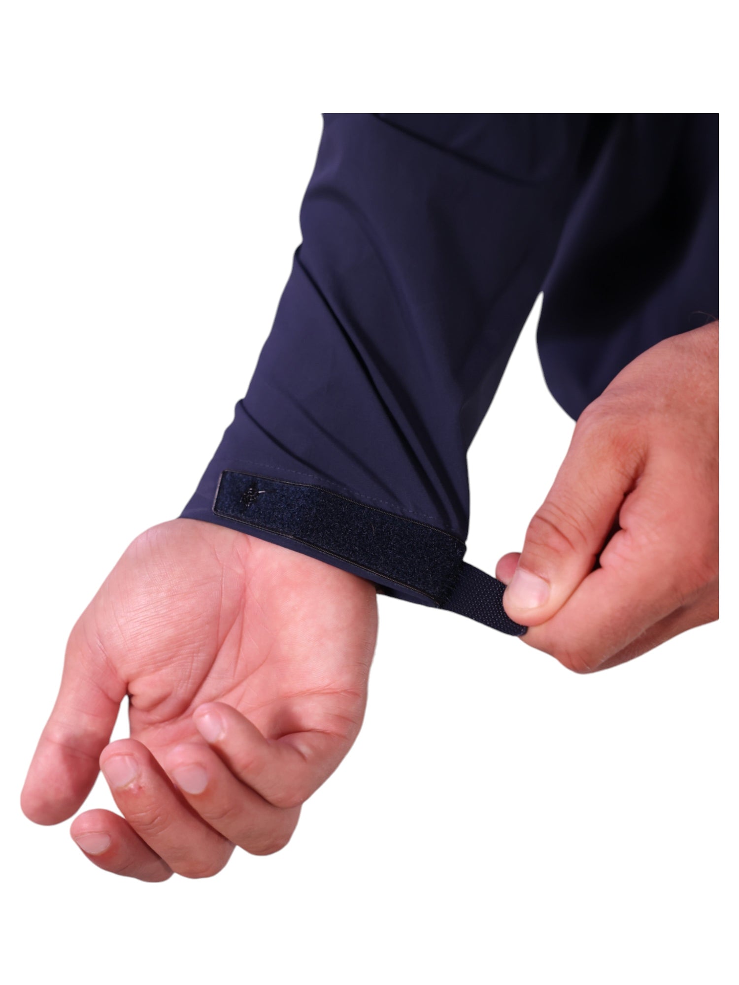 Fully Waterproof jacket. Lightweight. For those days you need to stay dry without the weight of a heavy rain jacket. Hood with double locked adjustment. Taped seams and waterproof zippers. Two hand pockets with covered zippers, chest pocket and forearm pocket. Icon logo left chest. Back reflective Icon logo. Bottom hem adjustment. Zippers white and reflective.