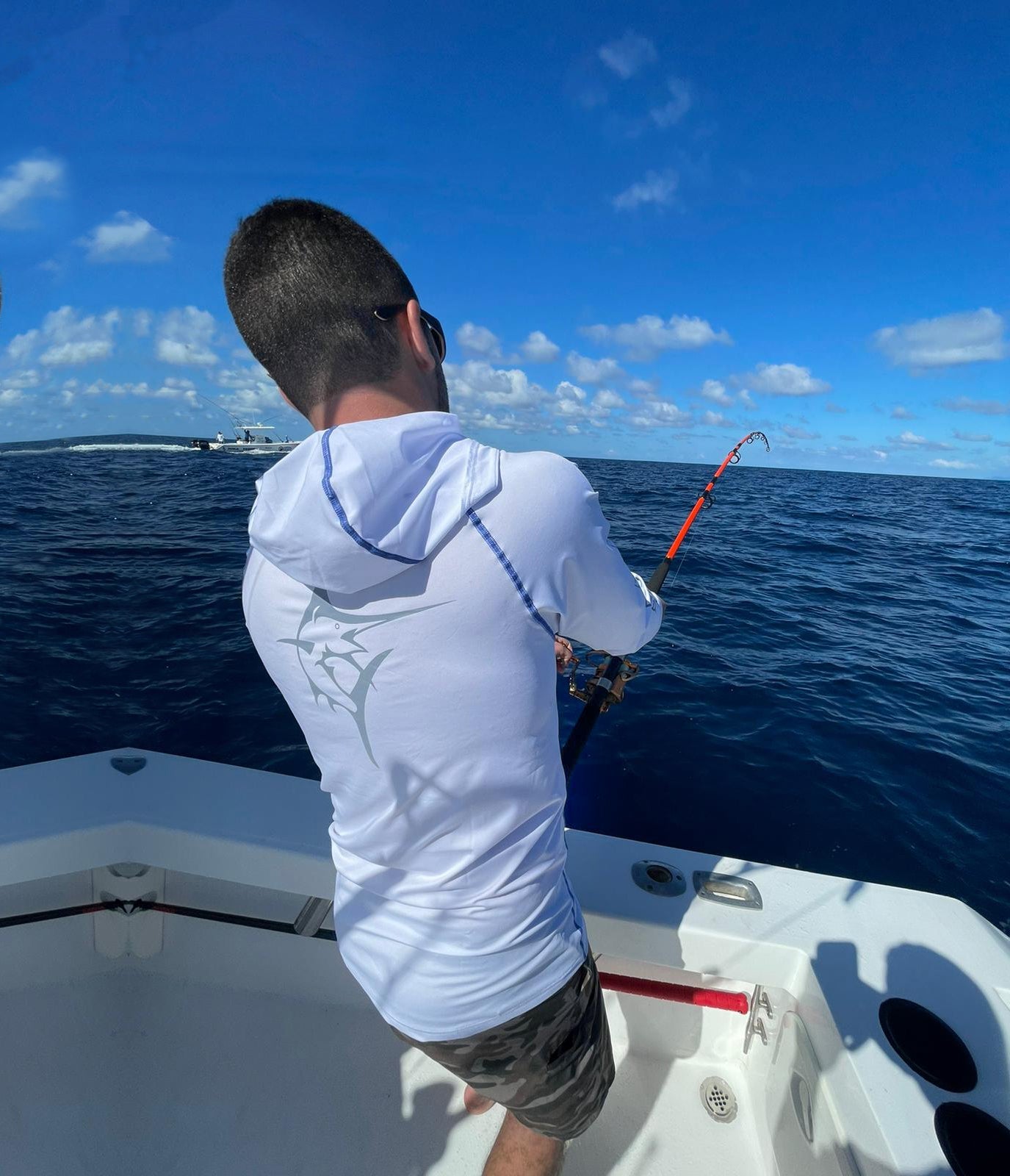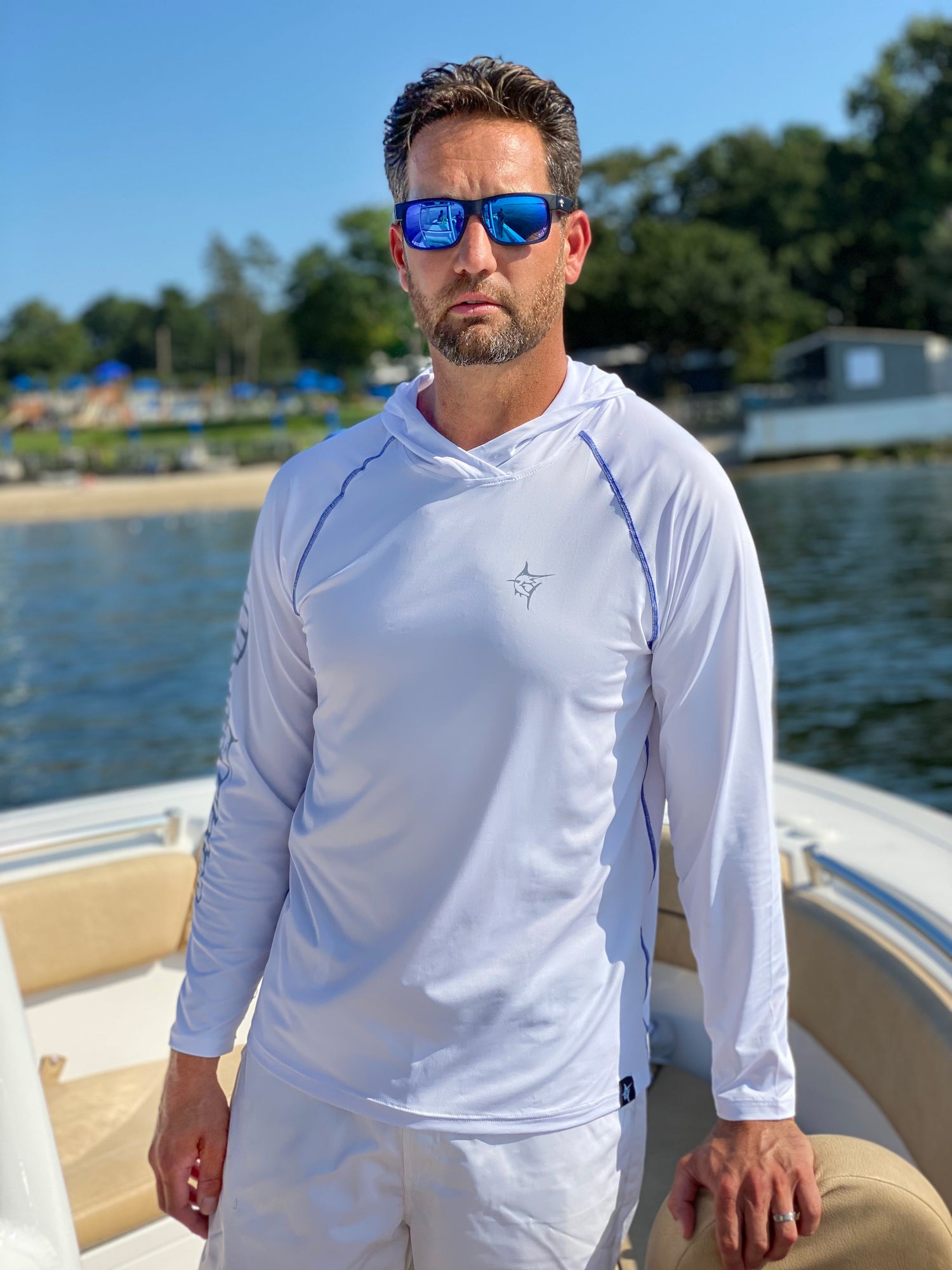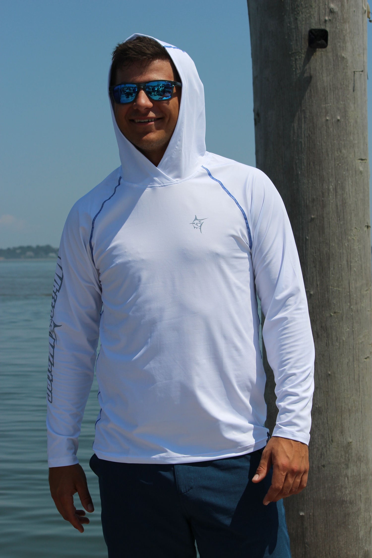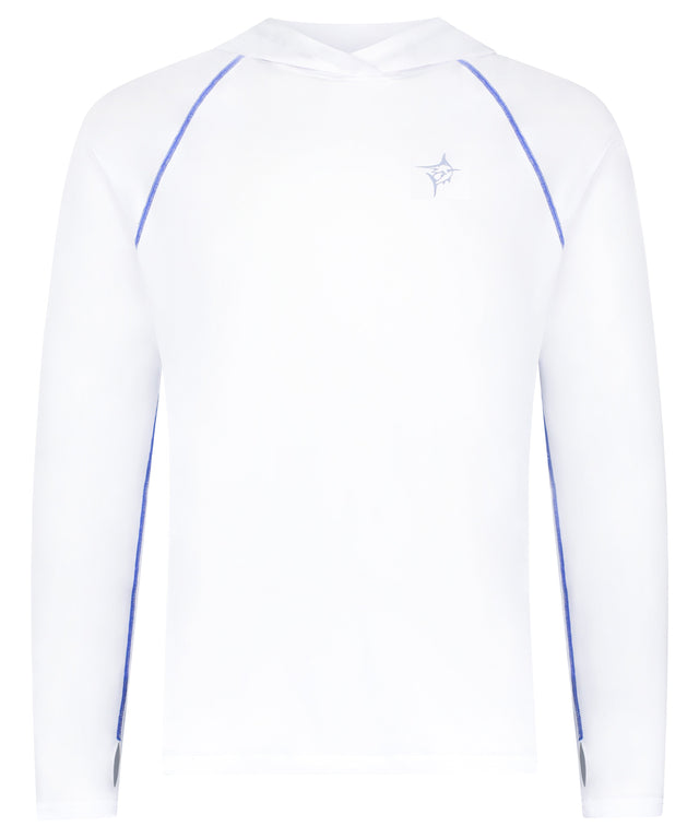 NEW AND IMPROVED. Performance lightweight hoody featuring soft poly spandex wicking fabric. Full Sun Protection, UV50 keeps you out of the sun and protected. Thumb holes to ensure full body protection and sleeves that stay in place. Plus added style with primary logo on the sleeve and contrast stitching. Great for the boat, beach and whenever you want to be looking good and protected from the sun.