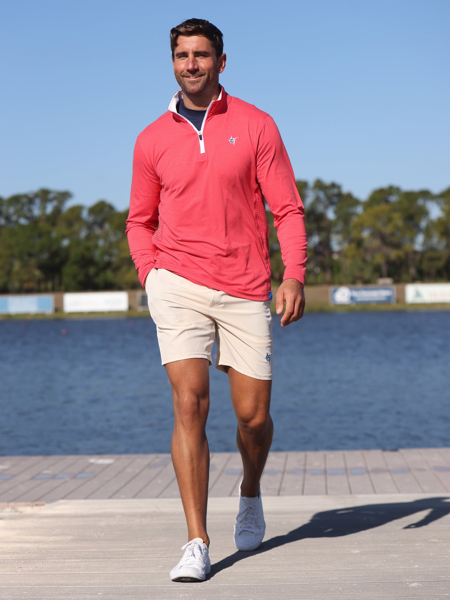Light weight performance quarter zip featuring soft poly spandex wicking fabric. Sun Protection, UV50 with laser insert venting to keep you cool when needed and patented silicone sleeve grip which holds your sleeves in place and keeps them clean. Perfect for every day.