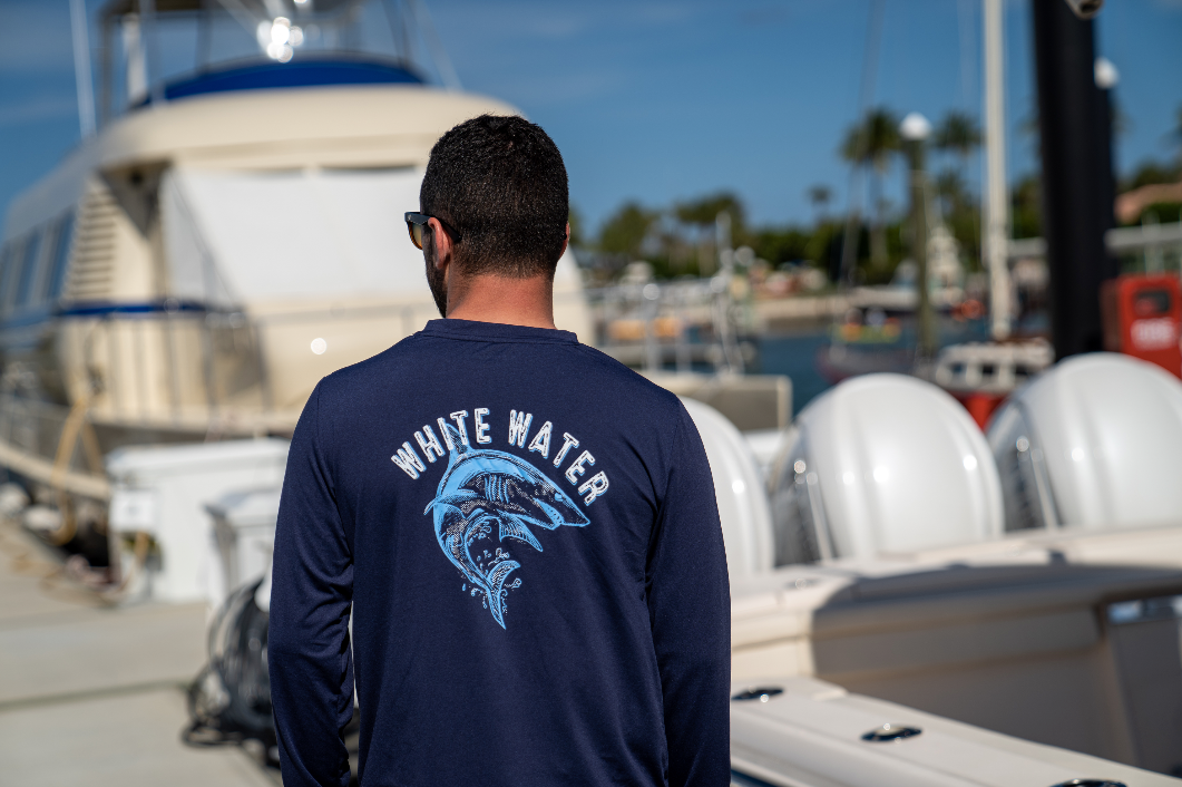 Our Shark Performance Tee comes in our Proprietary UV50, 360 Flex Stretch speed dry fabric, which we brushed for the ultimate hand feel, added stretch for ultimate mobility and comfort. You may be hard pressed to believe this is a performance fabric and not cotton!