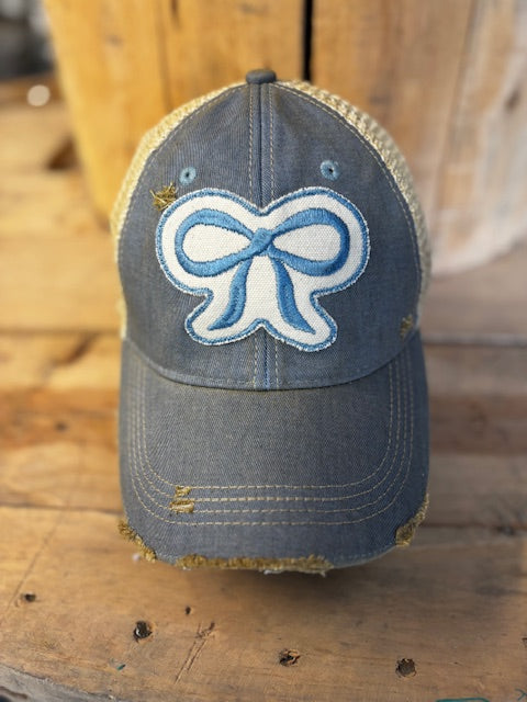Blue Bow Distressed Mesh Snapback Baseball Cap
