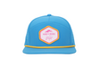 Blue 7-panel hat made of 95% polyester and 5% spandex. Mountain patch on front.