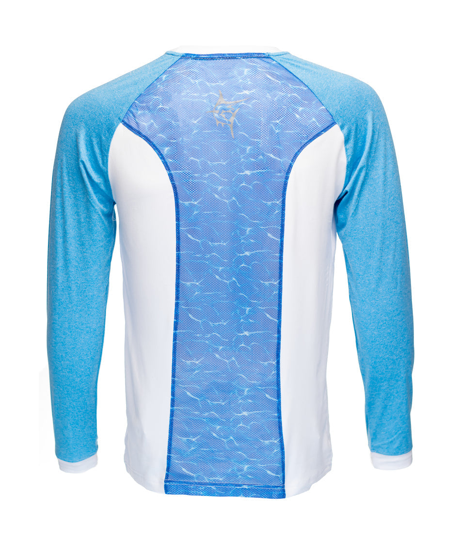 For those long runs to the deep when you need sun protection but also need to stay cool. Ultimate for both. Featuring the softest performance fabric created in a UV50, moisture wicking, quick dry with all way stretch. Raglan long sleeve with center back ultra-mesh in our exclusive water print. Never seen before Patent Pending Ultra Flex Grip. Those days of the open cuff stained sleeves are gone. Now when you are rigging your baits or just want to stay cool, raise your sleeve cuffs and they will stay in place with our silicone sleeve grip. A tri-colored silicone band around the interior sleeve cuff will keep your cuffs in place and clean.
