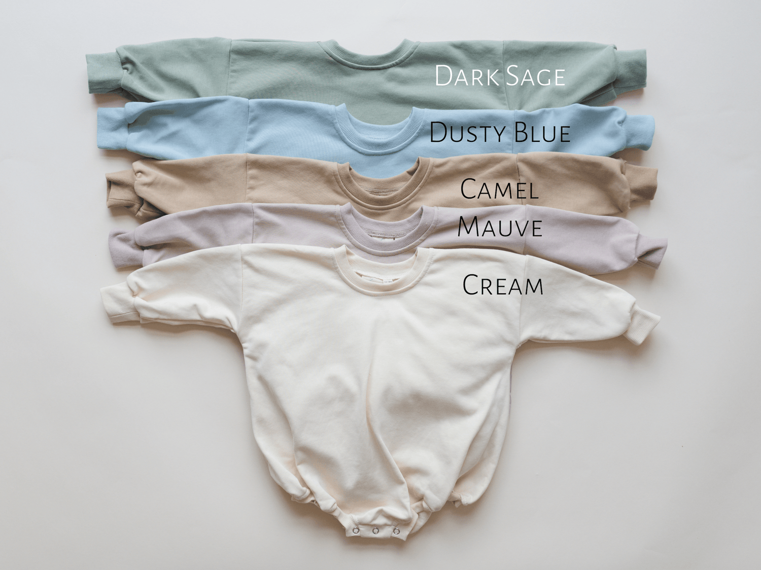 Retro ghost graphic oversized sweatshirt romper with snaps at crotch. Lightweight terry material.