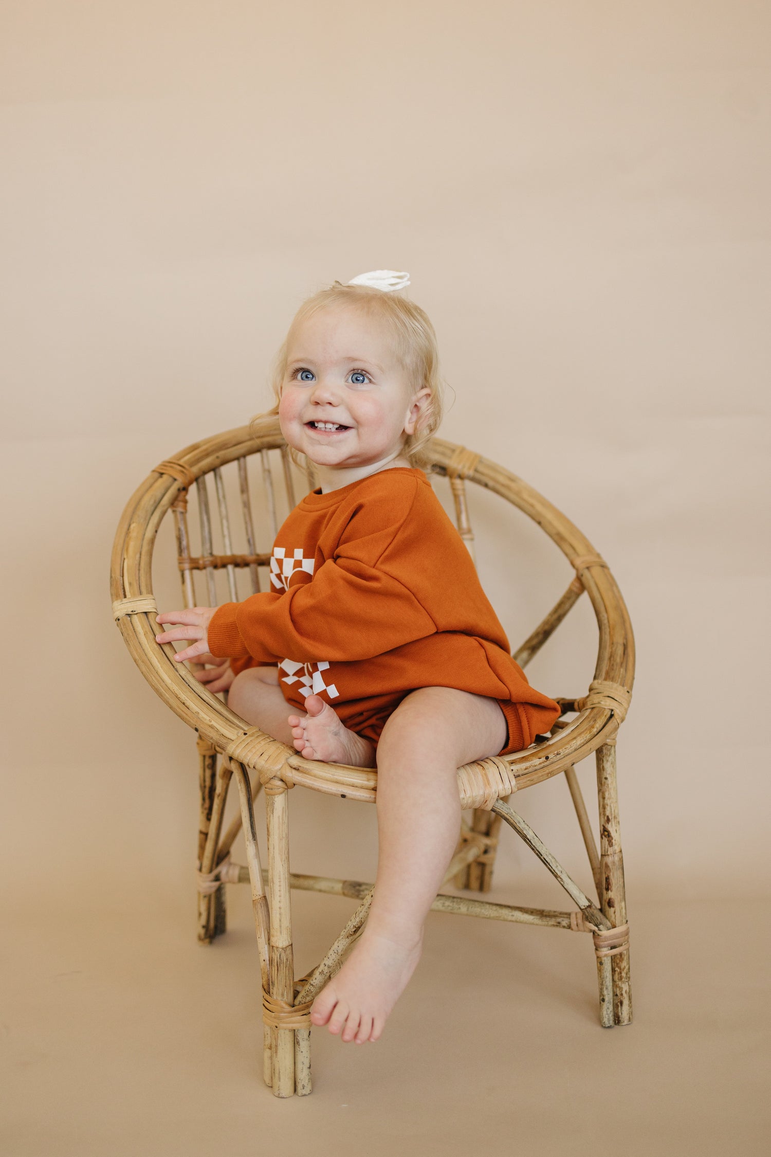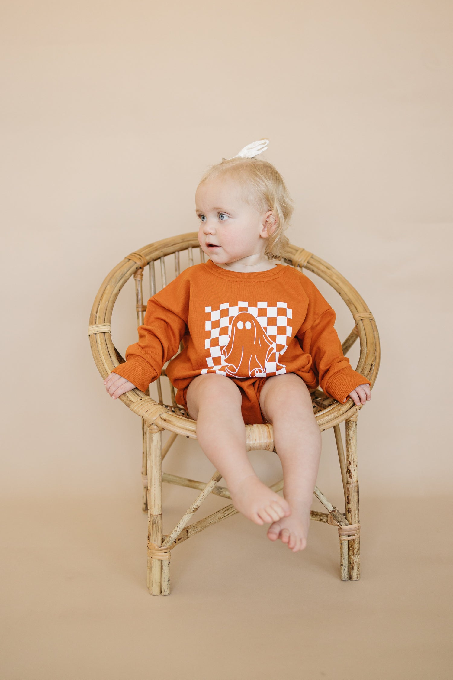 Checkered Ghost Sweatshirt Romper - Newborn / Cream w/White Ink is backordered and will ship as soon as it is back in stock.