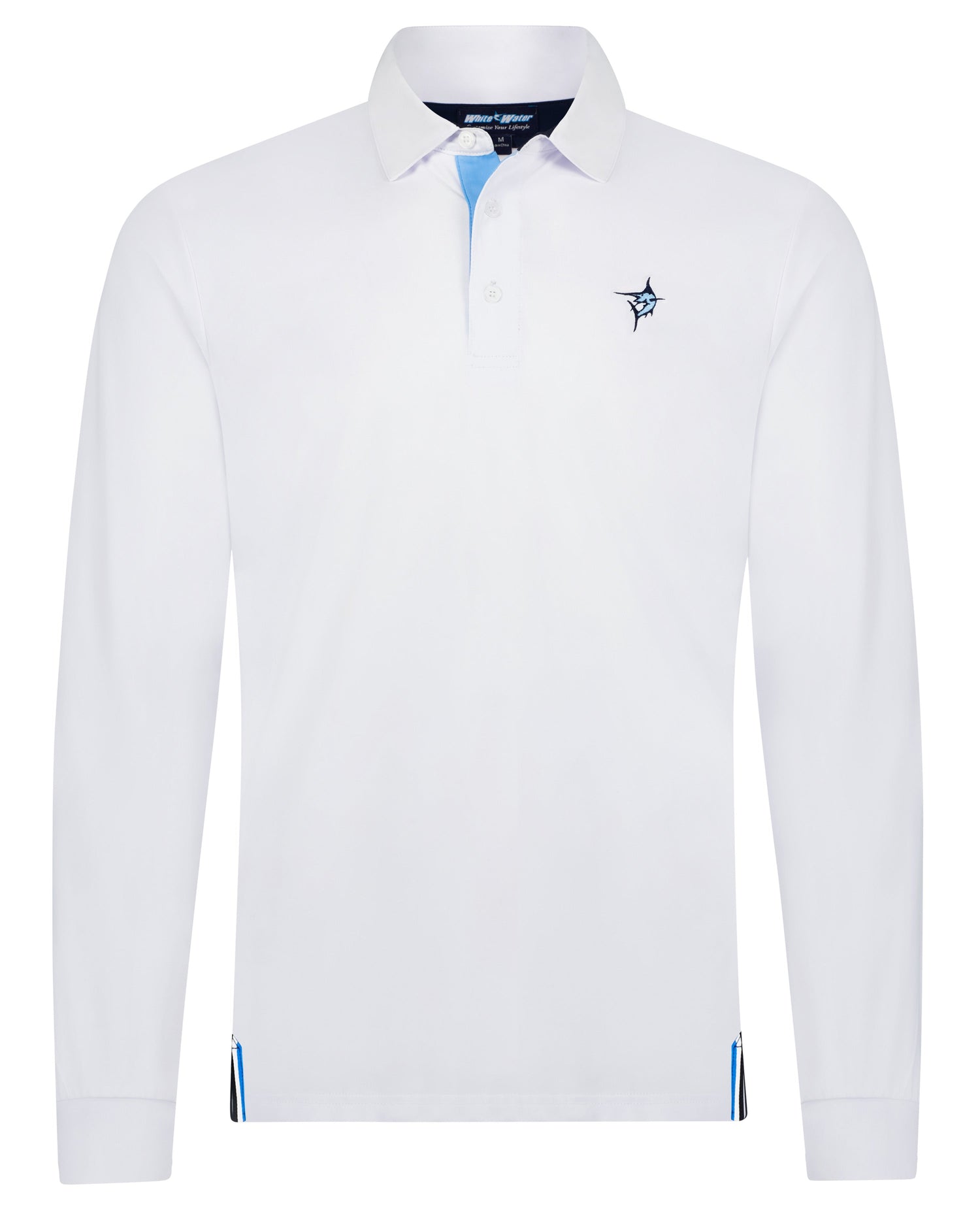 Long sleeve polo. Incredibly soft lightweight fabric with sun protection and wicking. Keeps you out and protected from the sun while staying comfortable on those hot days. Great base layer or long sleeve golf polo on those cooler spring and summer days. Embroidered left chest logo and silicone logo on back neck. Available in white and Navy.
