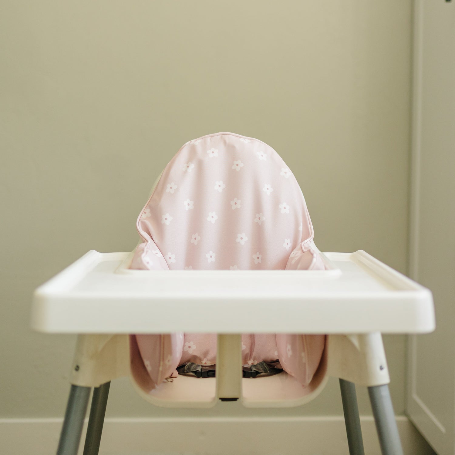 White Flowers on a pink background! Wipeable cushion cover for the IKEA Antilop Highchair