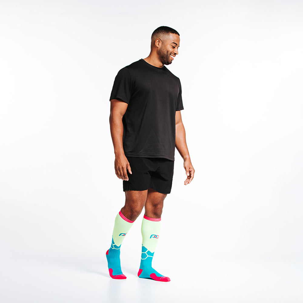 Durable over-the-calf compression socks with our distinctive BOOM pattern in a palette of bright neon, teal, and fuschia.