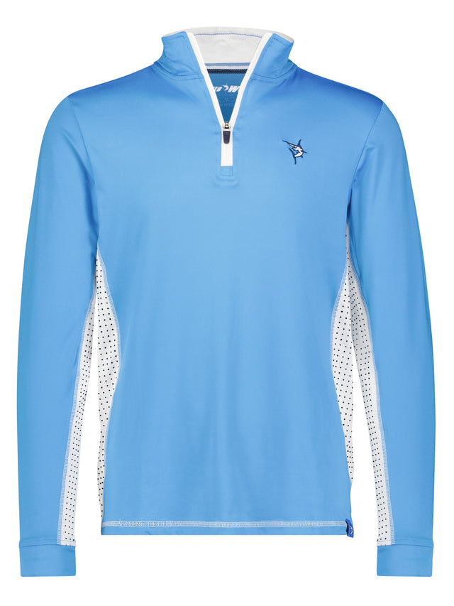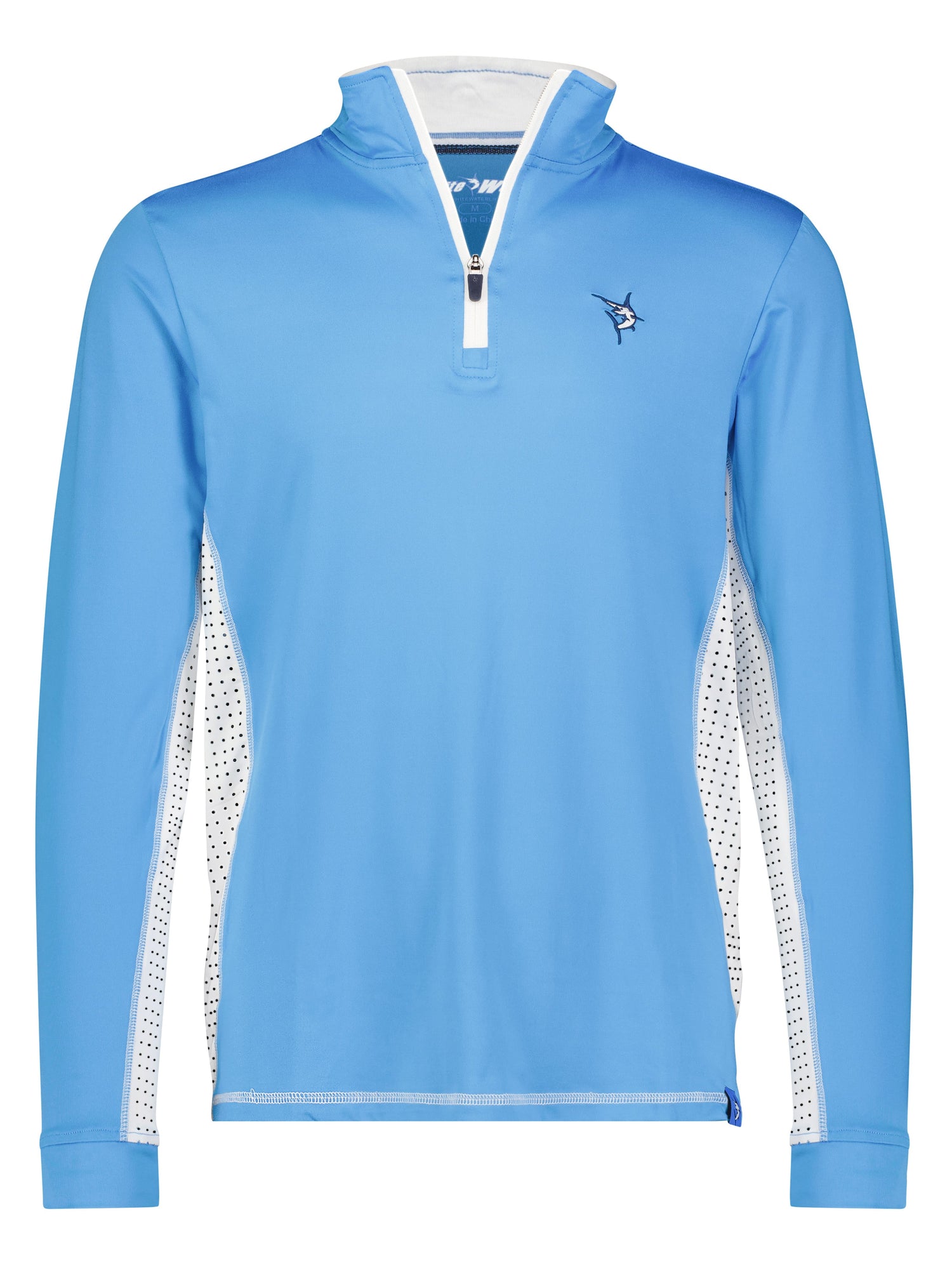 Light weight performance quarter zip featuring soft poly spandex wicking fabric. Sun Protection, UV50 with laser insert venting to keep you cool when needed and patented silicone sleeve grip which holds your sleeves in place and keeps them clean. The stylish Southport also features contrast collar, cuffs, and venting. Perfect for every day.