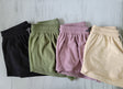 The Shorts are made with medium weight, stretchy organic French Terry. The fit loose and flowy, the length is about mid thigh. The wide elastic waistband sits right at your natural waist.